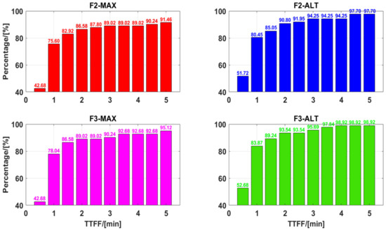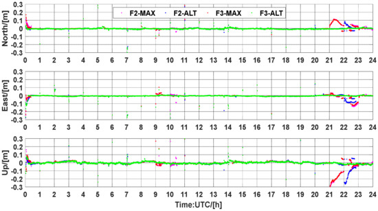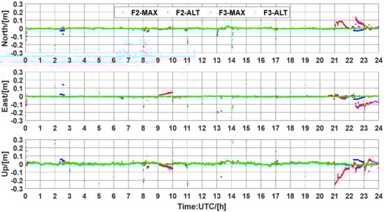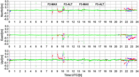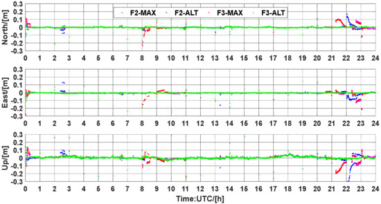 Figure 7 shows the statistical results of the cumulative distribution of TTFF, which is considered the time taken to achieve ambiguity resolution. In F2-MAX, 75.60% of ambiguities can be resolved within 1 min, whereas this value is 80.45% for F2-ALT. Similarly, in three-frequency PAR, 78.04% of F3-MAX and 83.87% of F3-ALT can be fixed within 1 min. One can see that the ambiguity proportions of 89.02%, 94.25%, 90.24%, and 95.69% are within 3 min for F2-MAX, F2-ALT, F3-MAX, and F3-ALT, respectively. Furthermore, 91.46% of ambiguities can be resolved within 5 min for F2-MAX in contrast with 97.07% of ambiguities when F2-ALT was used for UCPPP PAR. In terms of three-frequency UCPPP PAR, an improvement of 3.99% can be achieved for F3-ALT compared to F3-MAX. It can be suggested that the ALT method has an obvious advantage over the MAX method regarding low TTFF. As the range of TTFF continued to increase, the difference between ALT and MAX decreased. Overall, the TTFF performance of F3-ALT was the best, whereas that of F2-MAX was slightly worse than those of the other three UCPPP PAR approaches.