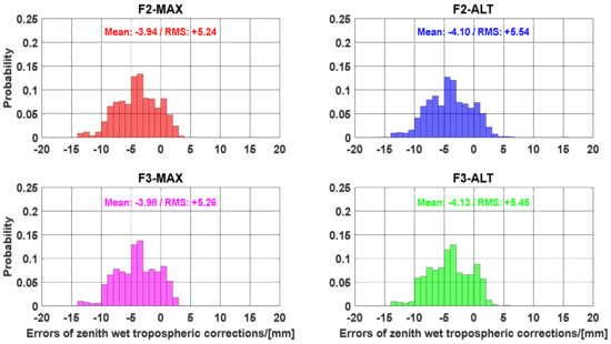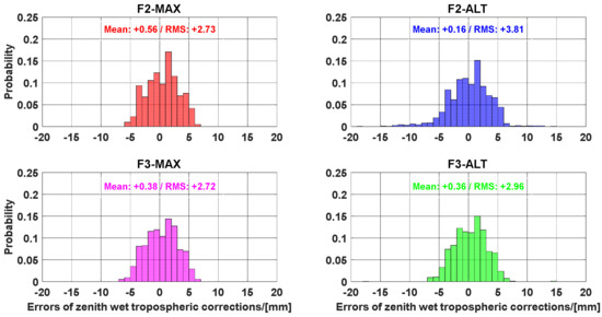 Figure 8 and Figure 9 show the error distribution of the zenith wet tropospheric corrections derived from the WARE and BRUX stations, respectively. It can be observed that most of the errors are within ±10 mm for the user stations. Furthermore, most of the errors were within ±5 mm for the WARE station. Meanwhile, the errors of zenith wet tropospheric corrections showed that the RMS of errors of 3 mm for the WARE station located in the reference network with an average distance of approximately 61 km, while the RMS of approximately 5 mm for the BRUX station was found at the reference network with an inter-station distance of approximately 81 km. Therefore, it was concluded that interpolated tropospheric corrections can be considered as accurate augmented information for improving UCPPP performance [56]. Unfortunately, compared with the highest elevation angle method, the Gram–Schmidt method does not exhibit an obvious advantage. In terms of the RMS of errors, the highest elevation angle method was slightly better than the Gram–Schmidt method. Overall, there is no clear difference between the Gram–Schmidt method and the highest elevation angle method in assessing the accuracy of zenith wet tropospheric corrections.