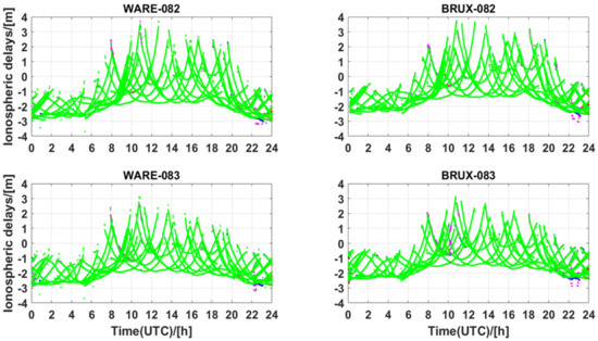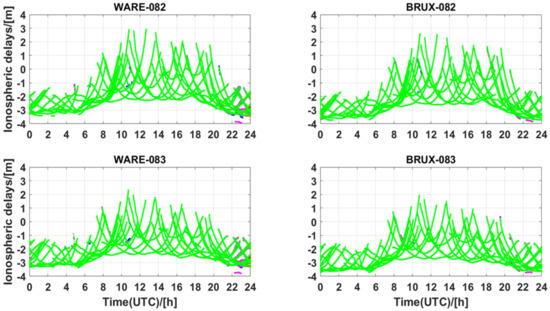 Figure 10 and Figure 11 present the slant ionospheric delay variations estimated from the user stations and interpolated from the reference stations with the processing session. The negative values of the ionospheric delays were caused by the impact of the receiver’s DCBs, as shown in Equation (8). As can be seen, there is a clear systematic offset between the estimated slant ionospheric delays and interpolated slant ionospheric corrections. This systematic offset was more obvious at the BRUX station.