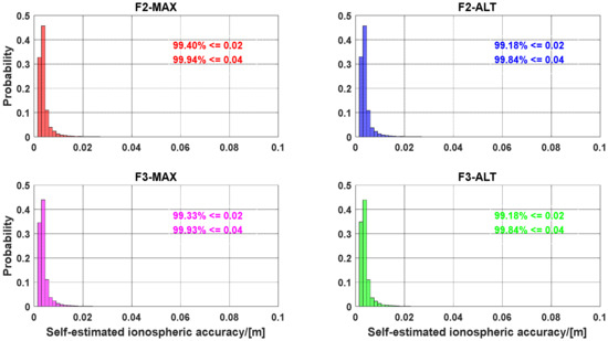 The accuracy of the slant ionospheric delays interpolated from the reference stations and estimated from the user stations are shown in Figure 12 and Figure 13, respectively. Regardless of the interpolated accuracy or estimated accuracy, different AR approaches have little effect on their accuracy distribution. However, because the distance error affects the interpolated accuracy of the ionospheric delays, the interpolated accuracy of ionospheric delays is lower than that of the estimated ionospheric delays, as shown in Equation (19).
