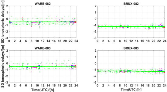 In this section, the WARE and BRUX stations are considered as the reference stations for retrieving UD atmospheric corrections. The accuracy of atmospheric corrections was evaluated by differentiating the atmospheric delays estimated from the user components and interpolated from the reference network.