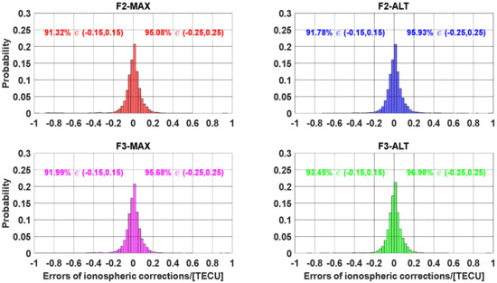 Figure 14 shows the characteristics of SD slant ionospheric delays. However, the impact of the receiver’s DCBs may be contained in SD ionospheric delays. To assess the accuracy of the slant ionospheric delays after eliminating the influence of the receiver’s DCBs, we performed the SD between satellites based on the original SD slant ionospheric delays. Based on the above analysis, the error distribution of the SD slant ionospheric delays is shown in Figure 15. For F2-MAX solutions, 91.32% of SD slant ionospheric residuals were within ±0.15 TECU, while 95.08% fell within ±0.25 TECU. The F2-ALT solutions within ±0.15 TECU account for 91.78% of SD ionospheric residuals, in contrast to 95.93% of SD ionospheric residuals being within ±0.25 TECU. From the bottom-right panel of Figure 15, it can be seen that 91.99% of the SD slant ionospheric residuals fall in ±0.15 TECU, which is worse than 93.45% for the F3-ALT method, which may imply an advantage over the F3-MAX method. Similarly, 95.68 and 96.98% of SD ionospheric residuals were within ±0.25 TECU in F3-MAX and F3-ALT, respectively. Overall, for both panels, regardless of whether dual-frequency or three-frequency conditions are used, the Gram–Schmidt method (ALT) always has a clear advantage over the highest elevation angle (MAX) approach. Combining the performance of UCPPP PAR, this fact suggests that the Gram–Schmidt strategy is reasonable for resolving SD NL ambiguities in contrast to the highest elevation angle approach.