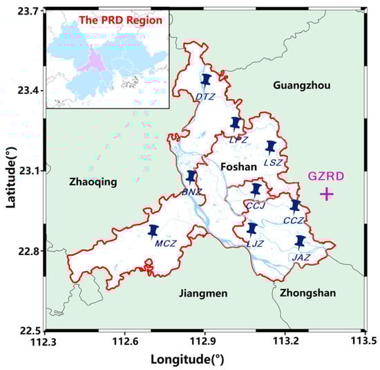 Geographical distribution of the FTLLS and WSR-98D. The map shows the locations of nine substations and the Guangzhou radar station. The location of the PRD region and Foshan city are shown in light blue and purple at the top left corner.