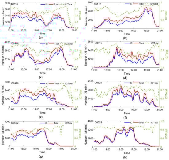 Measured total lightning data for eight days: (a–h) Time series of total lightning, IC events and the ratio of IC/Total Lightning. The red and blue solid lines represent the numbers of total lightning and IC events, respectively, while the green dot line represents the ratio of IC events to total lightning. The label in the upper left corner is the date of the thunderstorm.