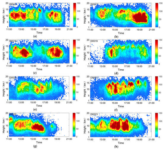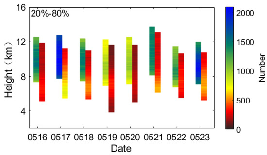 Figure 3 demonstrates the height distribution versus time in each day, with the color representing the number of IC events per six-minute interval. In the temperature range of 0 to −40 °C, liquid water and ice particle coexist forming a mixed-phase region where most electrification is thought to occur [31]. The environment temperatures of 0 °C and −40 °C were 3.5 km and 10.5 km, respectively. The largest number of IC events concentrated on 8–13 km with the number over 150 in the time interval of 6 min during eight days, except on 20 May when the frequency was lower than other days and the maximum only reached 138. This indicates that the collisions between cloud particles and the electrification process existed mainly in the area where lightning events gather at the height between 8 and 13 km. It has been discovered by ample observational evidence that the higher lightning frequency may be related to the higher surface temperature and higher cloud heights [32,33]. Noted that before or after the most severe period of thunderstorms (also the periods with high lightning frequency), the IC events are located at a much higher altitude. For example, during the period from 15:00 to 17:00 in Figure 3b, the altitude of the thunderstorm is between 12 and 15 km, which is much higher than that of the more severe part of the storm from 17:30 to 20:30. This may serve as a robust precursor to predict the beginning or dissipating of thunderstorms.