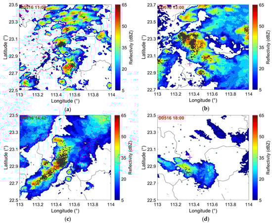 Staking chart of radar echo and lightning location. Radar reflectivity at a different time within the analysis area. The black dots show the spatial distribution of total lightning on 16 May. (a) The thunderstorm was in its initiating stage when the reflectivity was >50 dBZ without corresponding lightning events in some place. (b,c). The thunderstorm was in its active stage when the reflectivity was >40 dBZ with quantities of lightning events. (d) The thunderstorm was in its dissipating stage when the reflectivity was <35 dBZ with dispersed lightning events.