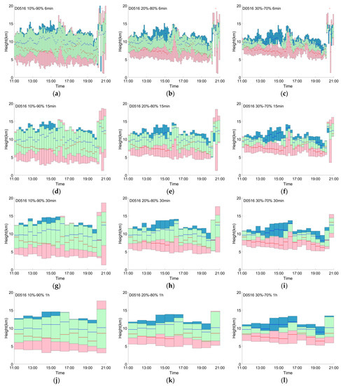 Electrical structure on 16 May: (a–c) The height range of positive and negative IC events versus time with three types of proportions every 6 min for 10 h within the area of 300 km × 300 km. (d–f) Same, except with the time interval of 15 min. (g–i) Same, except with the time interval of 30 min. (j–l) Same, except with the time interval of 1 h. The pink part denotes sources in the region with only negative IC events, and the blue part with only positive IC events. The green part denotes sources with both positive and negative IC events. The red solid lines represent the median height of the sorted negative IC events, and the blue solid lines represent the median height of the sorted positive IC events.