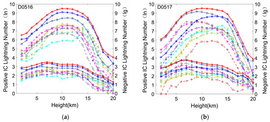 The number of positive IC events gradually increases at first, peaks at near 11 km and then drops rapidly; however, the trend of negative IC events differs from the positive. The variation in the number of negative IC events presents a saddle shape. There is more than one peak as the height rises, with the first peak at around 6 km and the second peak over 15 km. The maximum number of positive IC events is located at the height between 10 and 15 km, with the negative events lying at the height between 6 and 8 km. The height corresponding to a large amount of positive IC events usually lasts for two or three kilometers as is seen in Figure 6b,d,e. The distributions of the number do not vary as significantly in 10 h, 5 h and 1 h, except that the number of IC events presents some differences with the evolution of thunderstorms. This indicates that no matter what stage the thunderstorm is on, the overall height distribution of positive and negative IC events stays stable.