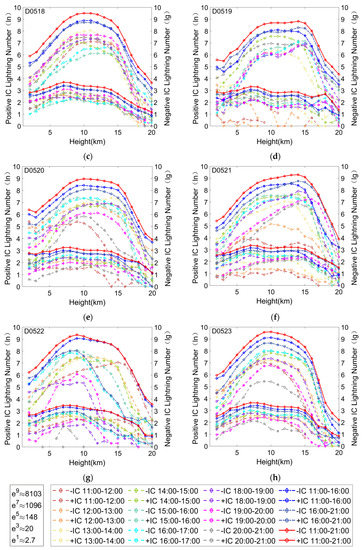 The number of IC events with the height in various time intervals: (a–h) The number of positive IC events is processed by the natural logarithm (the left y-axis), while the number of negative IC events is processed by the denary logarithm (the right y-axis). Lines marked with circles belong to the positive events, and lines marked with diamonds represent the negative events. The solid red lines show the number of IC events versus height during the whole 10 h, with the dark blue chain-dotted lines in the first 5 h (from 11:00 to 16:00) and the light blue chain-dotted lines in the second 5 h (from 16:00 to 21:00). The dot lines represent the distribution of IC events in 60 min from 11:00 to 21:00.