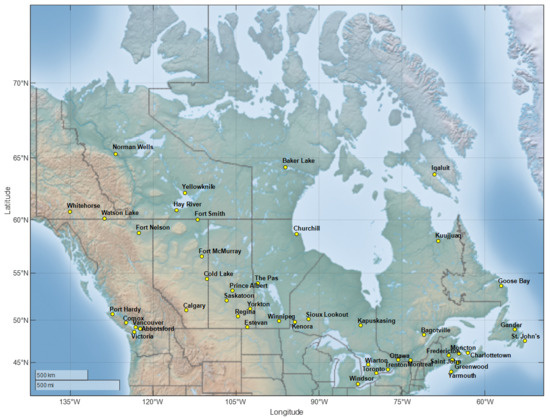 Forty-five long-term records of air temperature data used in this work were obtained from the archive maintained by Environment and Climate Canada [22] (https://climate.weather.gc.ca/historical_data (accessed on 10 April 2022)). Hourly air temperature time series, recorded at international and local airports (Environment and Climate Change Canada, 2022) were chosen for their availability of unaltered high-frequency records. The climate stations identified in Figure 1 were selected to represent the majority of Canadian climate regions presented in Figure 2. Table 1 lists the station’s geographic coordinates, data ranges, and percentages of missing data. Locations of stations range from 42.3° N (Windsor) to 65.3° N (Norman Wells) in latitude and from 52.3° W (St. John’s) to 135.1° W (Whitehorse) in longitude. The majority of temperature records span over 69 years in length except for Baker Lake, St. John’s, Norman Wells, and Cold Lake stations with records ranging between 58 and 66 years. The percent of missing data for the stations used varied from 0.03 (Gander, Moncton, Toronto, Regina, Vancouver) to 1.49 (Trenton) percent of hourly temperature measurements.