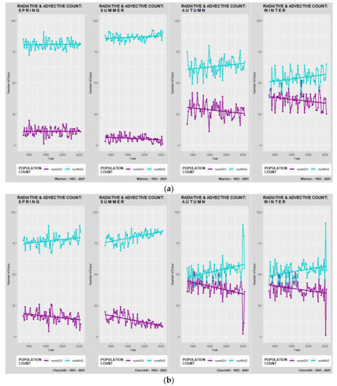 (a)—Great Lakes/St. Lawrence Lowland (GRL); Wiarton (ON), (b)—Northeastern Forest (NEF); Churchill (MB). Seasonally averaged radiative and advective temperature population counts, listed in order of Spring, Summer, Autumn, and Winter. (a)—Radiative Population Count (RPC) (cyan blue), and Advective Population Count (APC) (purple).