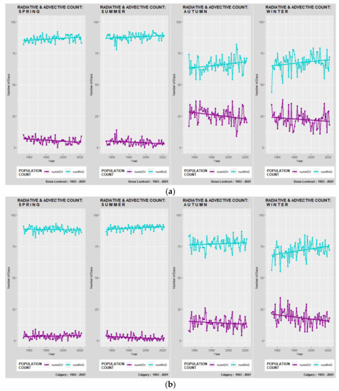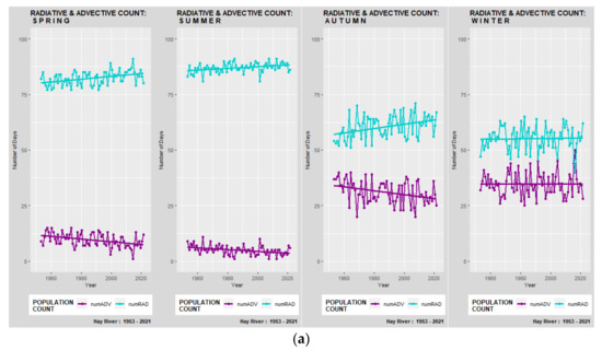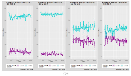 3.2. Time Evolution of Seasonally Averaged Trends of Radiative and Advective Day Counts