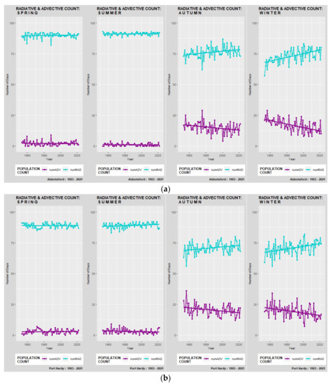 (a)—South British Columbia Mountains (SBC); Abbotsford (BC), (b)—Pacific Coast (PAC); Port Hardy (BC). Seasonally averaged radiative and advective temperature population counts, listed in order of Spring, Summer, Autumn, and Winter. (a)—Radiative Population Count (RPC) (cyan blue), and Advective Population Count (APC) (purple).