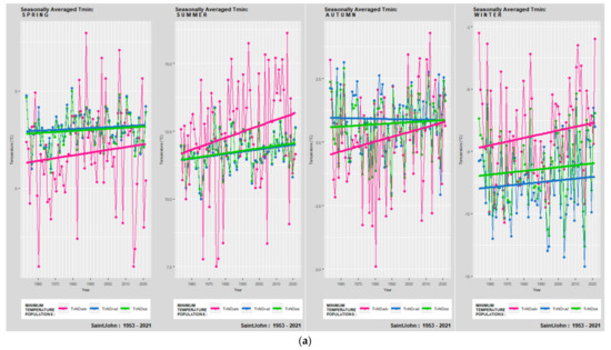 Atlantic Canada (ATL); Saint John (NB). Seasonally averaged daily temperature minima (a) and maxima (b), listed in order of Spring, Summer, Autumn, and Winter. (a)—Total Temperature Minimum (TTn) (green), Radiative Temperature Minimum (RTn) (blue), and Advective Temperature Minimum (TTn) (pink); (b)—Total Temperature Maximum (TTx) (brown), Radiative Temperature Maximum (RTx) (orange), and Advective Temperature Maximum (TTx) (purple).