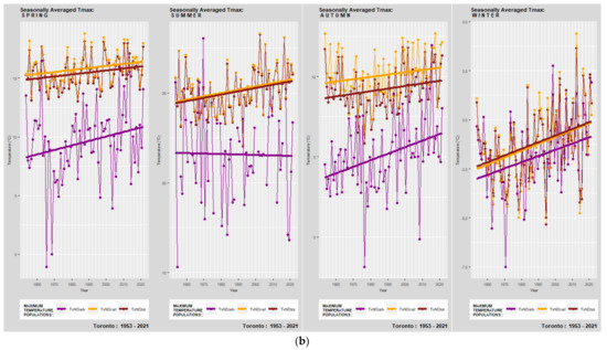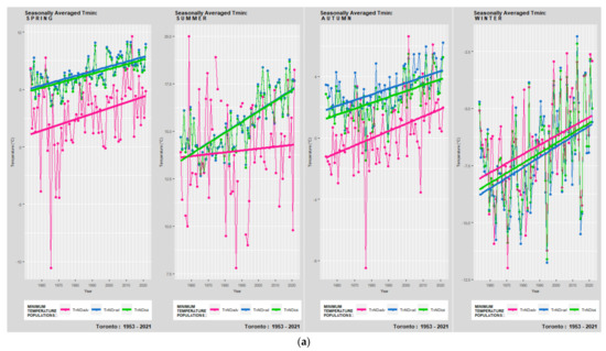 Great Lakes/St. Lawrence Lowland (GRL); Toronto (ON). Seasonally averaged daily temperature minima (a) and maxima (b), listed in order of Spring, Summer, Autumn, and Winter. (a)—Total Temperature Minimum (TTn) (green), Radiative Temperature Minimum (RTn) (blue), and Advective Temperature Minimum (TTn) (pink); (b)—Total Temperature Maximum (TTx) (brown), Radiative Temperature Maximum (RTx) (orange), and Advective Temperature Maximum (TTx) (purple).