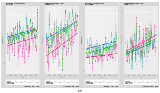 Northeastern Forest (NEF); Churchill (MB). Seasonally averaged daily temperature minima (a) and maxima (b), listed in order of Spring, Summer, Autumn, and Winter. (a)—Total Temperature Minimum (TTn) (green), Radiative Temperature Minimum (RTn) (blue), and Advective Temperature Minimum (TTn) (pink); (b)—Total Temperature Maximum (TTx) (brown), Radiative Temperature Maximum (RTx) (orange), and Advective Temperature Maximum (TTx) (purple).