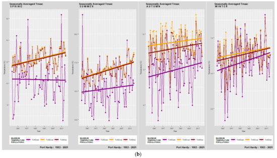 Pacific Coast (PAC); Port Hardy (BC). Seasonally averaged daily temperature minima (a) and maxima (b), listed in order of Spring, Summer, Autumn, and Winter. (a)—Total Temperature Minimum (TTn) (green), Radiative Temperature Minimum (RTn) (blue), and Advective Temperature Minimum (TTn) (pink); (b)—Total Temperature Maximum (TTx) (brown), Radiative Temperature Maximum (RTx) (orange), and Advective Temperature Maximum (TTx) (purple).