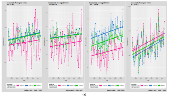 Arctic Tundra (ART); Baker Lake (NU). Seasonally averaged daily temperature minima (a) and maxima (b), listed in order of Spring, Summer, Autumn, and Winter. (a)—Total Temperature Minimum (TTn) (green), Radiative Temperature Minimum (RTn) (blue), and Advective Temperature Minimum (TTn) (pink); (b)—Total Temperature Maximum (TTx) (brown), Radiative Temperature Maximum (RTx) (orange), and Advective Temperature Maximum (TTx) (purple).