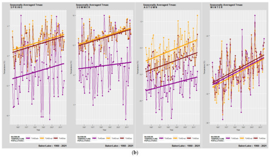 Mackenzie District (MCD); Norman Wells (NT). Seasonally averaged daily temperature minima (a) and maxima (b), listed in order of Spring, Summer, Autumn, and Winter. (a)—Total Temperature Minimum (TTn) (green), Radiative Temperature Minimum (RTn) (blue), and Advective Temperature Minimum (TTn) (pink); (b)—Total Temperature Maximum (TTx) (brown), Radiative Temperature Maximum (RTx) (orange), and Advective Temperature Maximum (TTx) (purple).