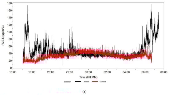 Mean (over location categories) PM2.5 concentrations during the sampling period were generally higher for indoor than outdoor samples, particularly during mealtimes when indoor mean concentrations peaked at 174.0 μg/m3 at 17:33:00 and at 177.4 μg/m3 at 06:39:00 (the highest outdoor mean concentration was 67.1 μg/m3 at 23:04:20; Figure 2). Indoor samples generally had mean (over location categories) RH between approximately 45% and 55% during the sampling period, which was lower than outdoor samples, which generally had a mean (over location categories) RH between approximately 60% and 70% during the sampling period. In contrast, the mean (over location categories) temperature for indoor samples was generally between approximately 20 °C and 25 °C during the sampling period, which was higher than for outdoor samples, which generally had a mean (over location categories) temperature between approximately 10 °C and 15 °C during the sampling period. For both indoor and outdoor samples, mean (over location categories) temperatures decreased during the sampling period until the morning mealtime, when they increased.