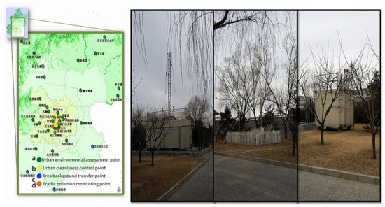 Figure 1. Location of monitoring sites of the Beijing Olympic Sports Center. Notes: The Chinese characters in the left picture is the meaning of Chinese Geographic Names, which also represents its geographical location. The green circle (a), yellow circle (b), blue circle (c), orange circle(d) in the left picture is the meaning of Urban environmental assessment point, Urban cleanliness control point, Area background transfer point, Traffic pollution monitoring point, respectively. And which the number of this points are 23, 1, 6, 5, respectively. - (5)