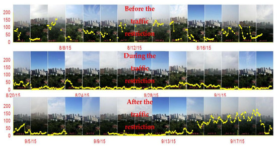 For evaluating the improvement effect of enhanced control and emission-reduction measures on air quality in Beijing, Figure 2 showed the hourly concentration of PM2.5 at Beijing Olympic Sports Center monitoring sites combined with photos of the sky from 8:00 a.m. to 08:30 a.m from 5 August to 19 September in 2015. By comparing the sky photos before, during, and after the traffic restriction, it could be seen that a blue sky appeared for 7 days during the traffic restriction and only appeared for 5 days before and after the traffic restriction. Before the restrictions, there were three pollution processes, the longest of which was four days. During the three pollution accumulation processes, the hourly concentration of PM2.5 exceeded 100 μg·m−3, and the maximum concentration of PM2.5 reached 153 μg·m−3 during the pollution accumulation process. There were no pollution processes during the traffic restriction. The maximum concentration of PM2.5 reached 58 μg·m−3 in the pollution accumulation process, and the concentration of PM2.5 remained below 100 μg·m−3, indicating that fine weather was dominant during the period of traffic restriction, but there were only 7 days with blue skies, which may be related to the weather situation at that time. After the traffic restriction, there was a pollution process. Compared with the traffic restriction, the pollution accumulation time and pollution degree increased, especially from 14 September to 18 September. The pollution accumulation time was most serious for 5 days, and the concentration of PM2.5 reached a maximum of 252 μg·m−3 during the pollution process. As can be seen from the maximum concentration of PM2.5 in the pollution accumulation process, the air quality during the traffic restriction was better than that before or after the traffic restriction. In addition, the average concentration of PM2.5 for 15 days before, during, and after the traffic restriction was 66, 18, and 52, respectively. The concentration of PM2.5 during the traffic restriction period was significantly lower than the concentration at other times, which showed that the enhanced control and emission-reduction measures significantly improved Beijing’s air quality.