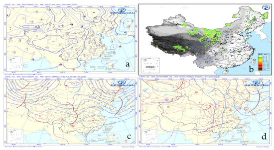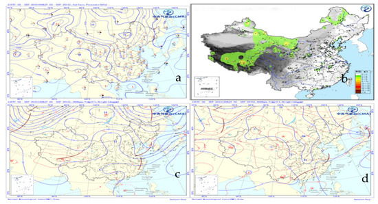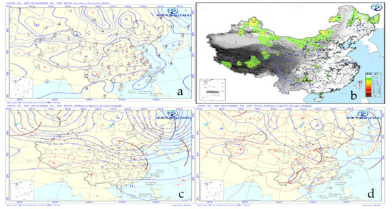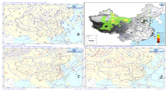 Maps of the weather and AQI situation at 07:00 on 1 September in 2015. Notes: (a,c,d) shows the map of the surface, 500 hPa height, 850 hPa height, respectively. (b) shows the automatic ground observation of 1 h wind field at 07:00 on 1 September in 2015.