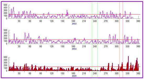 Daily mean value of PM2.5 in monitoring sites of the Olympic Center from 2013 to 2015. Notes: The unit on the y-axis is μg·m−3. The vertical green line and red line show the comparison over the same period when the 2015 Military Parade and 2014 APEC for three years from 2013 to 2015, respectively. The transverse red line shows the concentration of PM2.5 is 115 μg·m−3.