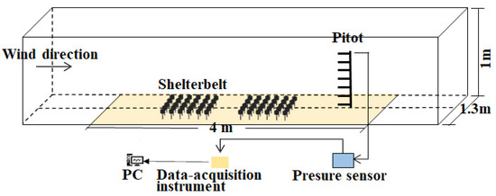 Our experiment was conducted in an indoor wind tunnel at the Xinjiang Institute of Ecology and Geography of the Chinese Academy of Sciences. The wind tunnel was a direct current blowing wind tunnel with a total length of 16.2 m and an experimental section of 8 m. The cross section was 1.3 × 1.0 m. A sidewall diffusion-type structure was used and the diffusion angle of each sidewall was 0.2°. A frequency conversion motor was used to adjust the wind speed by altering the current frequency. The wind speed level could be continuously adjusted from 0 to 20 m·s−1 based on the experimental requirements [47]. A schematic of the wind tunnel structure is shown in Figure 1.