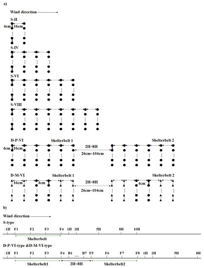 Design of the shelterbelt model and distribution of the wind speed observation points. Sub-figure (a) shows the different configuration modes of the shelterbelt (● arbor; ▲ shrub). Sub-figure (b) shows the distribution of the wind speed observation points of three types of shelterbelts (S-type represents the single shelterbelt with different rows; D-P-VI-type represents double pure shelterbelts comprising arbors; D-M-VI-type represents double mixed shelterbelts comprising arbors and shrubs, and VI represents the number of rows in each shelterbelt; H represents the height of the arbor).