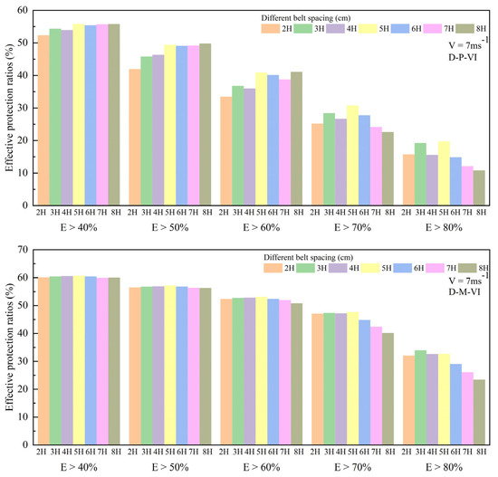 Comparing the effective protection ratio between the shelterbelts of the D-P-VI and D-M-VI protective forests, it can be concluded that the wind protection ability of the D-M-VI protective forest was superior to that of the D-P-VI protective forest under the same shelter efficiency and belt spacing (Figure 11). Figure 11 shows that the effective protection ratio between the shelterbelts of the D-P-VI protective forest with different belt spacings varied little under the same shelter efficiency and the difference between shelterbelts of the D-M-VI protective forest was even smaller. For example, when the shelter efficiency was 50%, the effective protection ratio between shelterbelts of the D-P-VI protective forest varied from 41.89% to 49.74%, whereas that of the D-M-VI protective forest varied from 56.22% to 57.11%. When the shelter efficiency was 60%, the range of variation was 33.42–41.01% for the D-P-VI protective forest compared to 50.69–53.03% for the D-M-VI protective forest. For the D-M-VI protective forest, the effective protection ratio between the strips of the protection forest showed a decreasing trend with the increase in the belt spacing under the same shelter efficiency. However, the D-M-VI protective forest maintained a good protection effect when the belt spacing was increased to 8H. For example, when the shelter efficiency was 70%, 40.08% of the area between the shelterbelts can reach over 70%.