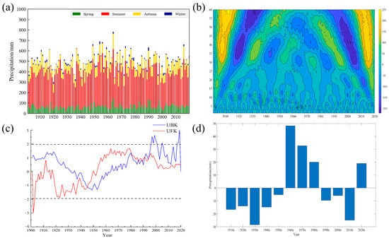 Test results of precipitation inconsistency in Haihe River Basin. (a) The process of precipitation change in Haihe River Basin; (b) Morlet wavelet test results; (c) Mann–Kendall Mutation test results; and (d) Cumulative anomaly change results (10 years).