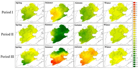 In the third period, the average precipitation tendency rate in the basin is 11.82 mm/10a, among which, the average precipitation tendency rate is −1.59 mm/10a in spring, 2.60 mm/10a in summer, 5.46 mm/10a in autumn, and 0.20 mm/10a in winter, which can be seen that the precipitation tendency in summer and autumn has obvious changes compared with the last two periods, and the regionalization of precipitation has become more obvious. From the perspective of seasonal precipitation tendency change in three periods, the climate pattern of the Haihe River basin has changed due to the influence of climate change and human activities, together with the emission of greenhouse gases and the change of the underlying surface, the stability of seasonal precipitation has changed. Especially in summer and autumn, the change trend is more intense, and the probability of seasonal disasters in the Haihe River basin with precipitation in summer and autumn as the main source of precipitation is significantly higher than before.
