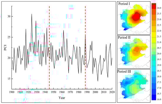 In the second period, climate change began to intensify [35,36], making the interannual precipitation variability in this period characterized by strong fluctuations. Between 1960 and 1970, the precipitation process in the basin changed drastically, and the precipitation variability in the four seasons was mostly summer precipitation variability, which led to an increase in the number of years with the basin precipitation PCI greater than 20 in this period compared with the previous period, and the number of years with the basin precipitation PCI greater than 20 in this period is 29, accounting for 67.44%, but from the distribution of mean and extreme values, the concentration of precipitation in this period has begun to decline, which is also reflected in the spatial distribution of PCI. Relative to the first period, the distribution characteristics of PCI in the east–central part of the basin changed significantly, but the western part of the basin and the northern part of the basin maintained the distribution characteristics of the previous period. This indicates that in the second period of climate change, the intra-annual precipitation distribution characteristics of the regions strongly influenced by the climate are changing, which is reflected in the decrease of the precipitation concentration index and the gradual moderating of the intra-annual precipitation distribution.