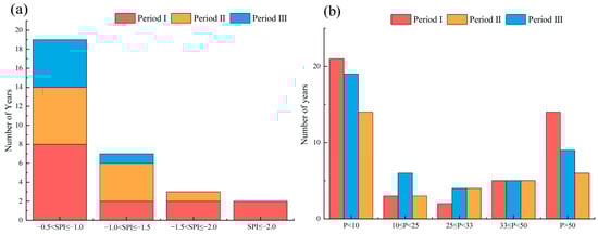 The SPI index can reflect the change of drought degree in the watershed, and combined with the drought frequency F (Figure 5a) and drought area ratio P (Figure 5b), the change of the drought process in the three periods can be more clearly understood. The results of the drought degree in different stages (Figure 5a) and the drought area distribution (Figure 5b) show that the frequency of drought in the first stage of the Haihe River basin is 31%, including 8 years of mild drought, 2 years of severe drought, and 2 years of extreme drought, and the first stage is the most severe drought among the three stages. After entering the second stage, due to the high total precipitation in this stage, the phenomenon of large-scale drought decreases, and there are no severe drought years or extreme drought years. After entering the third stage, the number of drought years increased due to the decrease in precipitation compared with the previous stage, but the overall change was not significant, which indicates that the precipitation in this stage increased compared with the first stage and the overall drought situation in the basin was alleviated.