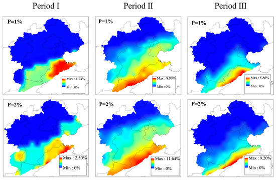 The Pearson type III probability distribution was used to calculate the 1% and 2% extreme precipitation probability distributions for each of the three periods, which can reflect the migration of the precipitation center of gravity and the change of disaster-prone areas in the basin, and the results are shown in Figure 7. It can be seen that, regardless of the 1% and 2% probability, the extreme precipitation probability distribution in the second period accounts for the largest proportion, and the high probability interval of extreme precipitation gradually moves from the southeastern part of the basin to the central and eastern coastal areas of the basin in terms of the change law of spatial distribution, which is consistent with the change law of precipitation tendency rate. Although the first period and the third period have the same periodic characteristics, there is a significant difference in the occurrence probability of the two extreme precipitations, where the extreme value of the 1% extreme precipitation probability changes from 1.74% to 5.86%, and the extreme value of the 2% extreme precipitation probability changes from 2.50% to 9.20%. From the changes in precipitation tendency rate extreme precipitation probability distribution, the precipitation in the Haihe River basin after 1990 showed an increasing trend, instability, and an increasing probability of extreme precipitation. It can be seen that under the environment of climate change, the characteristics of extreme precipitation in Haihe River Basin have changed gradually, the influence range of extreme precipitation events is enlarged, and the regularity of precipitation is gradually changing. The precipitation regularity summarized for a region in the past may no longer be applicable after entering a new climate state.