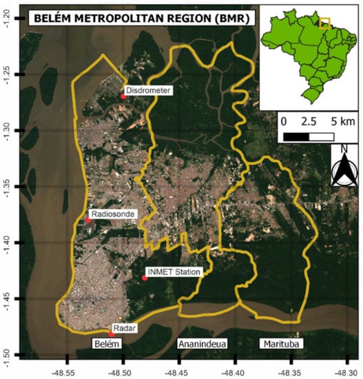 In the Brazilian part of the Amazon Rain Forest, one of the most important urban areas is located at its northeastern border, and it is called Belém Metropolitan Region (BMR). This area is formed by seven municipalities that are brought together by its socio-economical characteristics. From these seven municipalities, Belém, Ananindeua, and Marituba are the municipalities where most of the BMR population, businesses, and industry are located []; therefore, in this study, the acronym BMR stands for these three places.