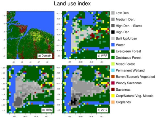 The BRM is not well represented by the model (Figure 2b), and to improve its representation, the amount of impervious land was extracted from Landsat 5 (1986) and Landsat 8 (2017) satellite images according to the impervious built-up index (IBI) calculation. The main difference observed between each year was the reduction of forest cover and the expansion of the urban area, with a higher density urban area appearing in the middle of what is considered the center of Belém (to the south, around 1.4° S and 48.52° W), and especially the expansion of the medium-density category (both categories were described below). The BMR is dominated by urban and forest land cover and areas destinated to crop growth are small in size and often are hidden by trees, so they are very difficult to be classified by satellite imagery.