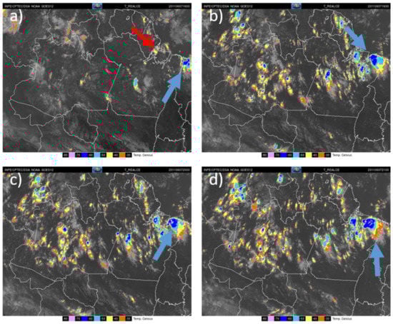 Figure 3 is composed of infrared satellite images detailing the evolution of a meteorological system that happened on 7 June 2011 (the blue arrows indicate its position). The system began its development in the Atlantic Ocean late in the morning, reaching the continent between Pará and Maranhão states borders at 1600 UTC (the local time is UTC−3 h) (Figure 3a). As the system moved westward, it grew, and the top of the clouds got colder, indicating deeper clouds (Figure 3b). When it reached the BMR (Figure 3c; around 2000 UTC), the system reached its maximum development, with the minimum cloud top temperatures between −80 and −70 °C. The dissipation phase started just after it passed the BMR (Figure 3d; 2100 UTC) and reached Marajó Island (red arrow).