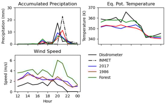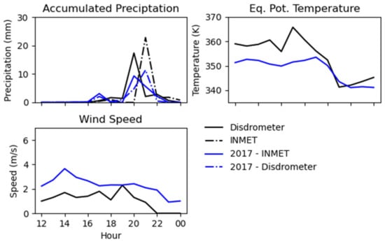 Time series of the accumulated precipitation (mm h−1), the equivalent potential temperature (K), and the wind speed (m s−1) for the observed at the Brazilian National Institute of Meteorology (INMET) Station (black solid lines) and at the disdrometer (black dashed line) and the 2017 scenario at the INMET Station point (blue solid line) and at the disdrometer (blue dashed line).