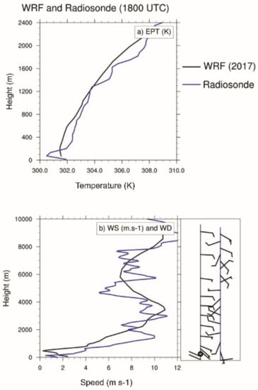 The vertical profiles of the EPT and the wind speed of the model followed the observation trends, although quantitative differences were noted (Figure 5). In general terms, the model was colder and drier than the observation, but both of them displayed an unstable layer of the atmosphere near the surface since the temperature decreased with the height.