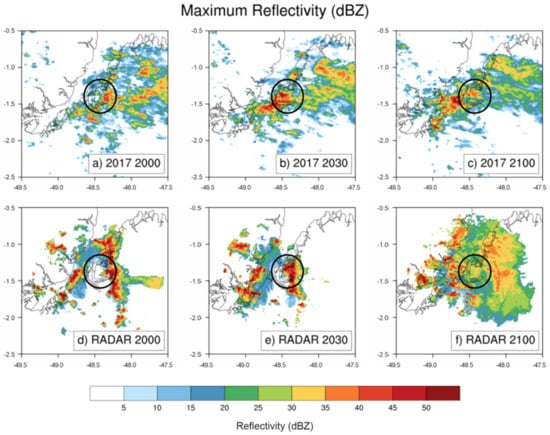 The noticed difference between the observed and modeled can be attributed to the small number of instruments available at the time to measure the atmospheric conditions to be used as initial conditions for the model []. Even so, the model performed reasonably well, reaching a maximum, at the BMR, above 40 dBZ at 2030 UTC, similar to the observed. At the next moment, this value was reduced to below 35 dBZ, higher than the radar, which was between 25 and 30 dBZ.