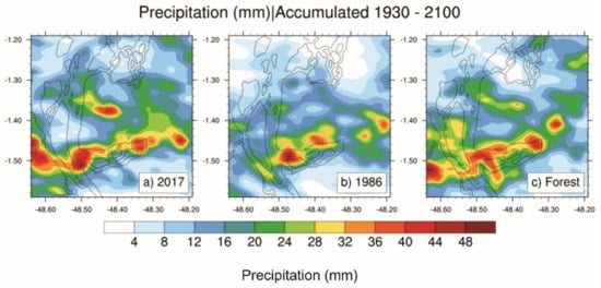 The spatial distribution of the accumulated precipitation during the storm between 1930 and 2100 UTC are shown (Figure 8). In all scenarios, part of the storm followed the river to the south of the BMR. However, there was less precipitation in the middle of the study area in the year 1986 scenario than in the forest one and especially in the year 2017 scenario, which displayed a large area in the middle of the BMR with a significant amount of precipitation during the storm.
