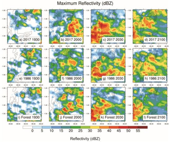 Maximum reflectivities (dBZ) for the 2017 (a–d), 1986 (e–h), and forest (i–l) scenarios at 1930, 2000, 2030, and 2100 UTC.