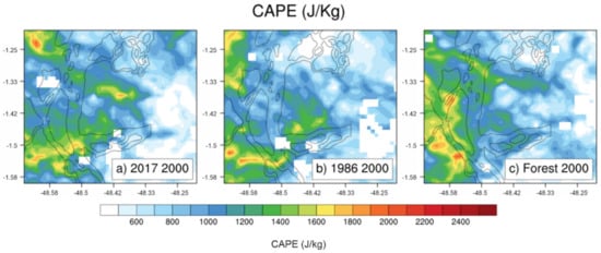 According to previous studies, moderate convection is expected to occur with CAPE ranging between 1000 and 2500 J kg−1, and strong convection with CAPE above 2500 J kg−1 [,]. The estimates of CAPE for each scenario are shown in Figure 10. Before the storm arrived over the BMR (2000 UTC), the middle of the BMR had a considerable amount of CAPE in 2017 (with values over 1600 J kg−1), but in other scenarios, it barely reached over 1000 J kg−1 in the same area. The south and southwest areas were common regions with CAPE over 1000 J kg−1 for all scenarios, particularly for the 1986 one.