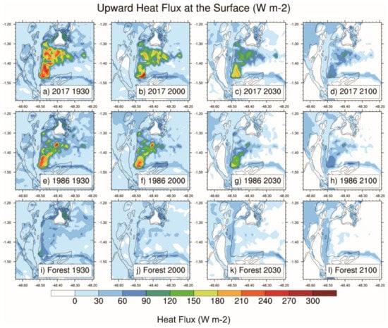 Upward heat fluxes (W m−2) for each of the 2017 (a–d), 1986 (e–h), and forest (i–l) scenarios at 1930, 2000, 2030, and 2100 UTC.