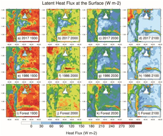 Latent heat fluxes (W m−2) for each of the 2017 (a–d), 1986 (e–h), and Forest (i–l) scenarios at 1930, 2000, 2030, and 2100 UTC.