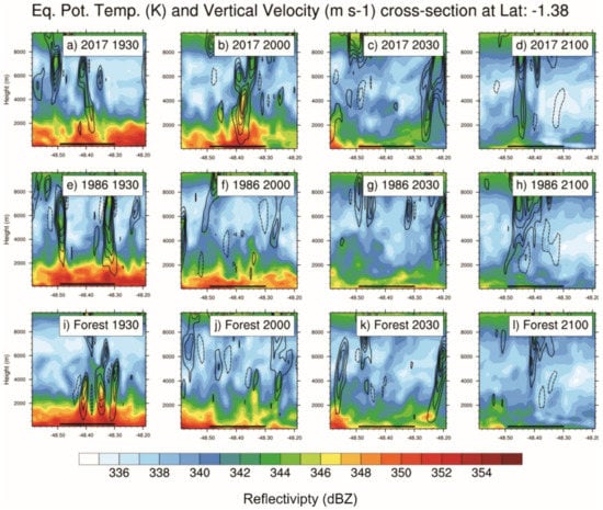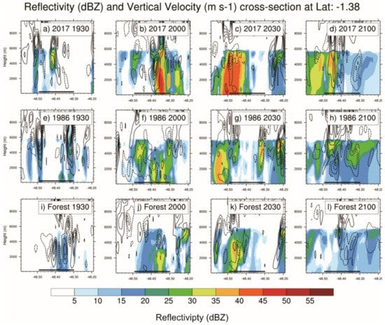 Reflectivity (dBZ) values for the 2017 (a–d), 1986 (e–h), and forest (i–l) scenarios at 1930, 2000, 2030, and 2100 UTC. The dashed contours are the negative vertical wind speed, and the solid contours are positive vertical wind velocity, ranging from −5 to 5 m s−1 and an increment of 1 m s−1. The black line near the x-axis represents the BMR.
