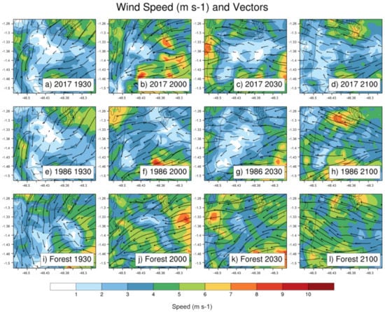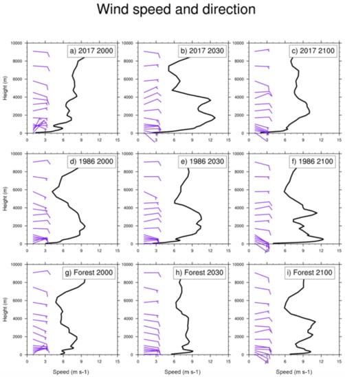The different building heights that compose an urban landscape increase the surface roughness length and reduce the wind speed across the BMR, keeping the system for a longer period inside the region and allowing it to grow stronger [,]. Figure 15 shows the vertical profile of the wind speed in the atmosphere. The forest scenario had a more homogeneous surface, which reduced the roughness, and the wind was faster. However, with urbanization and the barrier effect caused by the buildings, the wind got slower near the surface, below 3 m s−1 for the 2017 and 1986 scenarios, while the wind in the forest scenario reached above 5 m s−1 at all considered times (from the ground up to 2000 m). The urban effect also increased the vertical wind shear, which was stronger in urban scenarios.