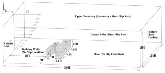 The developed numerical method in Section 3 was used to run a simulation considering an urban intersection to analyse pollutant concentrations on the street canyon walls. Figure 2 shows the new building distribution and walls considered for pollutant concentration analysis. A 1:150 scaled design was positioned perpendicular to the approaching flow for the simulation. The validated computational domain [,,,,,] and boundary conditions, described in Figure 1, were considered for this simulation as well.
